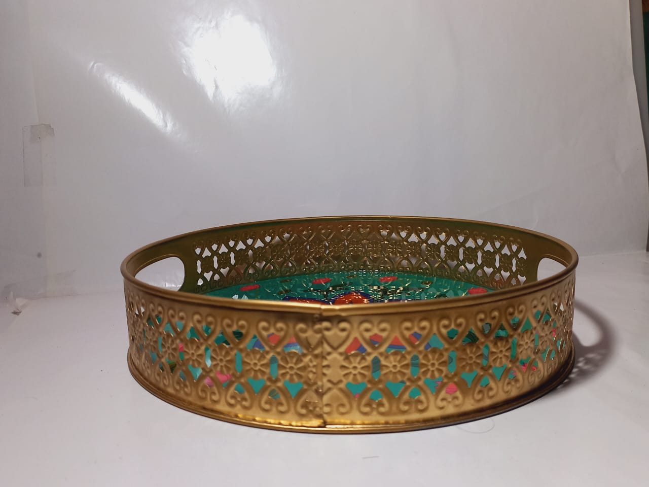 This is a beautiful iron tray with a size of 8×8 inches. The outer part has a golden finish, giving it a premium and elegant look. The inside is decorated with enamel work, featuring a green base with a large red and blue floral design in the center, surrounded by small pink flowers and leafy patterns. The edges have a delicate cutwork design, adding to its charm.